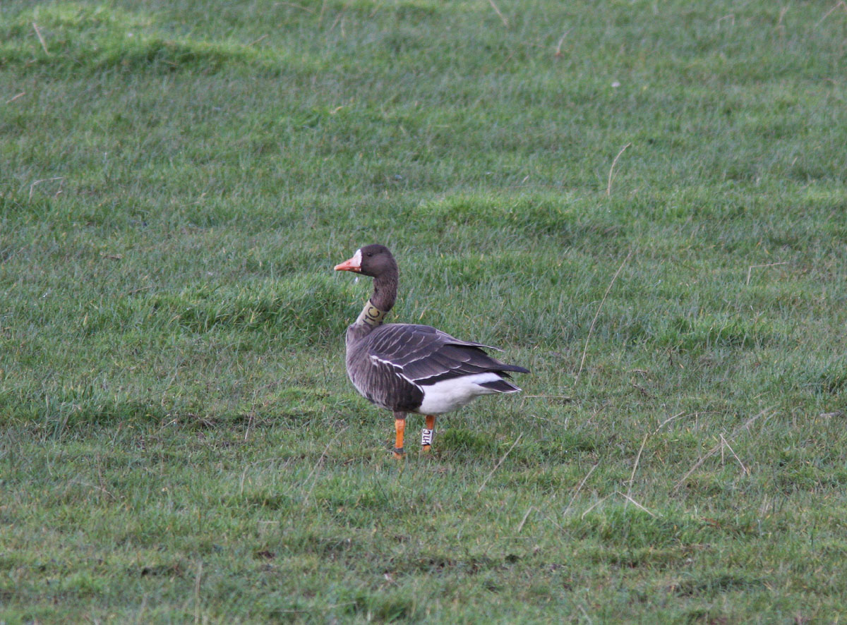 There seem to have been a lot of dispersed Greenland White-fronted Geese this autumn: Iceland had an extraordinarily mild season and many geese remained there until a very cold snap in late November forced the last birds out. At the beginning of this month quite a few showed up in Norway, we think the result of the late stayers being caught out in unfavourable and strong winds from the west. Numbers at many winter resorts in mid November were 60-80% what we would expect, so many geese are still making their way back to their traditional wintering sites. It could well be that H1C was simply en route to Wexford when you found her!